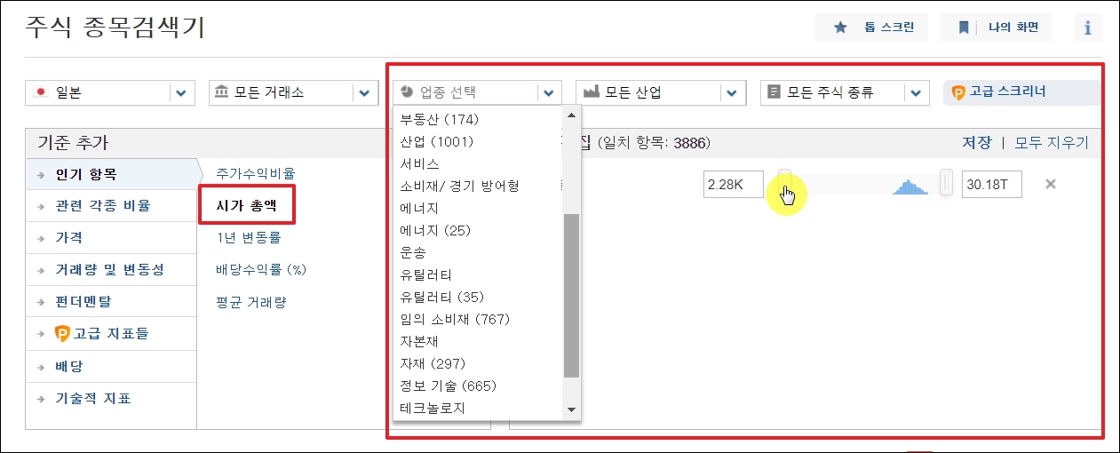 ▼이번에는 기준을 추가할 차례입니다. 주가수익비율, 시가총액, 1년 변동률 등 여러 기준을 추가할 수 있습니다. 시가 총액을 선택하면 우측에 있는 공간에 해당 기준이 추가됩니다. 기준을 보면 최소 금액과 최대 금액을 조절할 수 있습니다. 업종 선택을 통해 알고 싶은 분야의 기업만 나열할 수도 있습니다. 부동산, 산업, 서비스, 에너지, 유틸리티, 자본재 등 다양합니다.