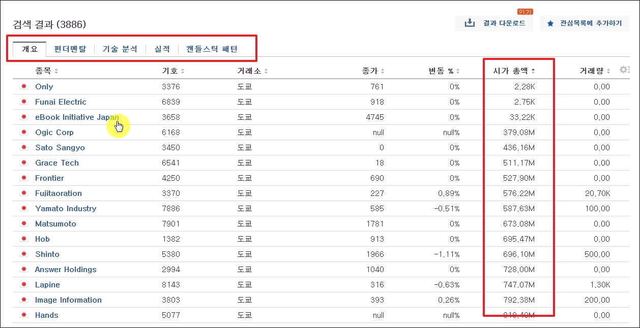 ▼검색 결과가 나타났습니다. 일본 시가총액 상위종목이 보입니다. 한 번에 3886개의 주식 종목이 나오기 때문에 한 화면에 담기 어렵습니다. 이런 연유로 직접 인베스팅 사이트를 이용할 수 있도록 방법을 알려드리는 겁니다.