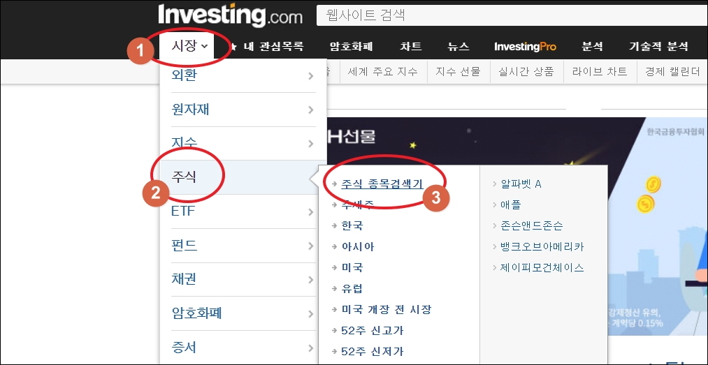 ▼인베스팅 공식 홈페이지에 접속하면 메뉴에서 [시장]과 [주식]을 차례대로 클릭합니다. 그럼 세계 모든 주식에 대한 하위 및 상위종목을 찾아볼 수 있는 [주식 종목검색기]가 나타납니다. 해당 메뉴를 클릭합니다.