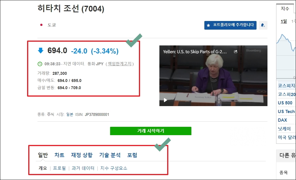 ▼표에서 관심 있는 종목의 기업 이름을 클릭해 봅니다. 그럼 실시간 시세 정보와 함께 재정상황, 기술분석 자료, 과거 데이터, 차트 등의 서비스를 이용할 수 있습니다.