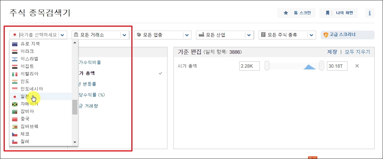▼주식 종목검색기를 이용하여 세계 시가총액 상위종목을 찾아보겠습니다. 가장 먼저 국가를 선택합니다. 앞서 언급한 바와 같이 전 세계 시장 규모로 미국이 가장 큽니다. 그 다음으로 중국, 일본, 독일 등이 있습니다.