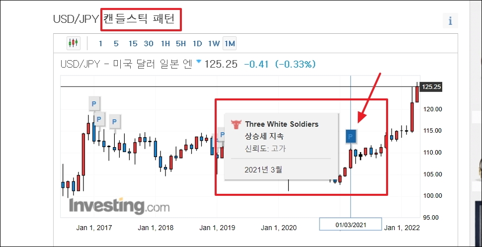 ▼앞서 언급한 캔들 패턴 분석을 위한 서비스를 이용해 보겠습니다. 메뉴에서 [캔들스틱 패턴]을 선택하면 바로 이용이 가능합니다. 엔화 환율 차트에 [P] 표시를 하여 유의미한 캔들을 찾아줍니다. [P] 표시 위에 마우스 커서를 올리면 캔들 패턴 분석 결과를 확인할 수 있습니다. 정망을 할 때에는 개인적으로 일봉 보다는 주봉이나 월봉으로 보는 것이 좀 더 낫습니다. 일봉은 속임수가 많기 때문입니다.