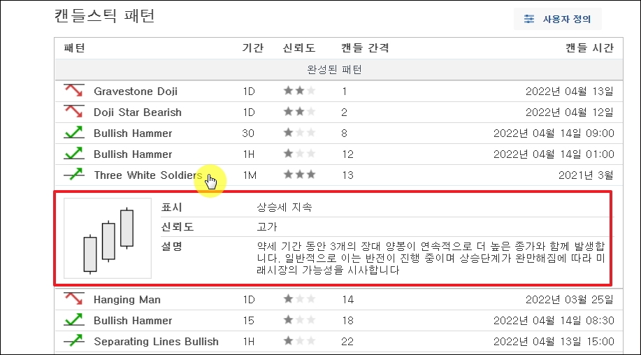 ▼캔들스틱 패턴 차트 아래를 보면 관련 표가 나옵니다. 여기에서 신뢰도 높은 것을 마우스로 클릭해 봅니다. 그럼 어떤 의미를 가진 캔들인지 설명을 통해 알 수 있습니다.