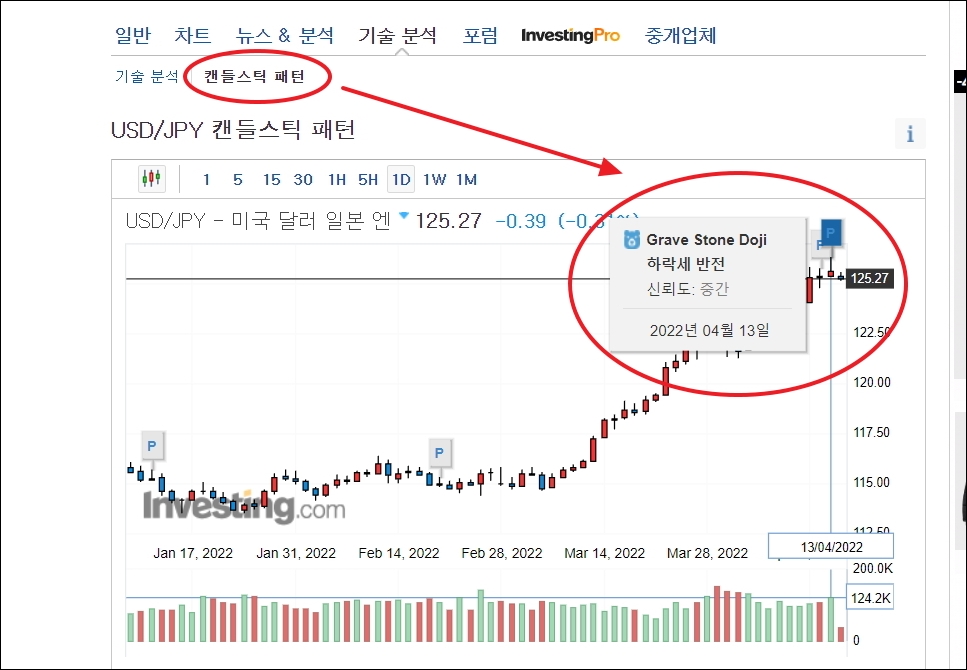 ▼앞서 언급한 캔들 패턴 분석을 위한 서비스를 이용해 보겠습니다. 메뉴에서 [캔들스틱 패턴]을 선택하면 바로 이용이 가능합니다. 엔화 환율 차트에 [P] 표시를 하여 유의미한 캔들을 찾아줍니다. [P] 표시 위에 마우스 커서를 올리면 캔들 패턴 분석 결과를 확인할 수 있습니다. 정망을 할 때에는 개인적으로 일봉 보다는 주봉이나 월봉으로 보는 것이 좀 더 낫습니다. 일봉은 속임수가 많기 때문입니다.