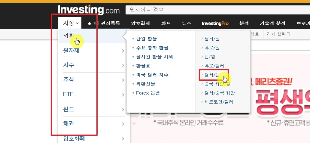 ▼사이트에 접속하면 메뉴에서 [시장]을 클릭해 봅니다. 그럼 외환 카테고리에서 엔화 환율에 관련된 메뉴를 찾을 수 있습니다.