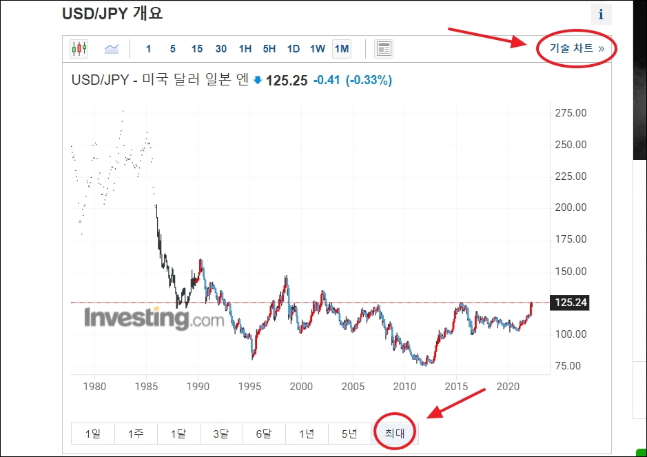 ▼현재 기준으로 엔화 환율에 대한 전망을 살펴보면 달러 강세, 엔화 약세가 지속되고 있는 상황입니다. 차트에서 최대로 기간 범위를 늘려보니 대반등 국면에 있음을 알 수 있습니다. 전고점을 뚫고 올라가려는 기세가 매우 강합니다. 최근 미국 연준에서는 긴축으로 방향을 틀고 있습니다. 이에 따라 많이 풀린 달러가 다시 미국으로 돌아갈 가능성이 높기 때문에 엔화 약세를 보이는 것으로 보입니다.