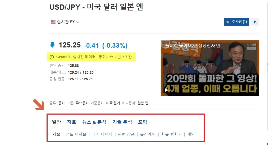 ▼새롭게 열린 페이지에서는 달러 대비 엔화 시세가 어떻게 변화하는지 실시간으로 파악할 수 있습니다. 여기에 더하여 뉴스, 분석, 차트, 포럼 등 유용한 서비스를 이용할 수 있죠.