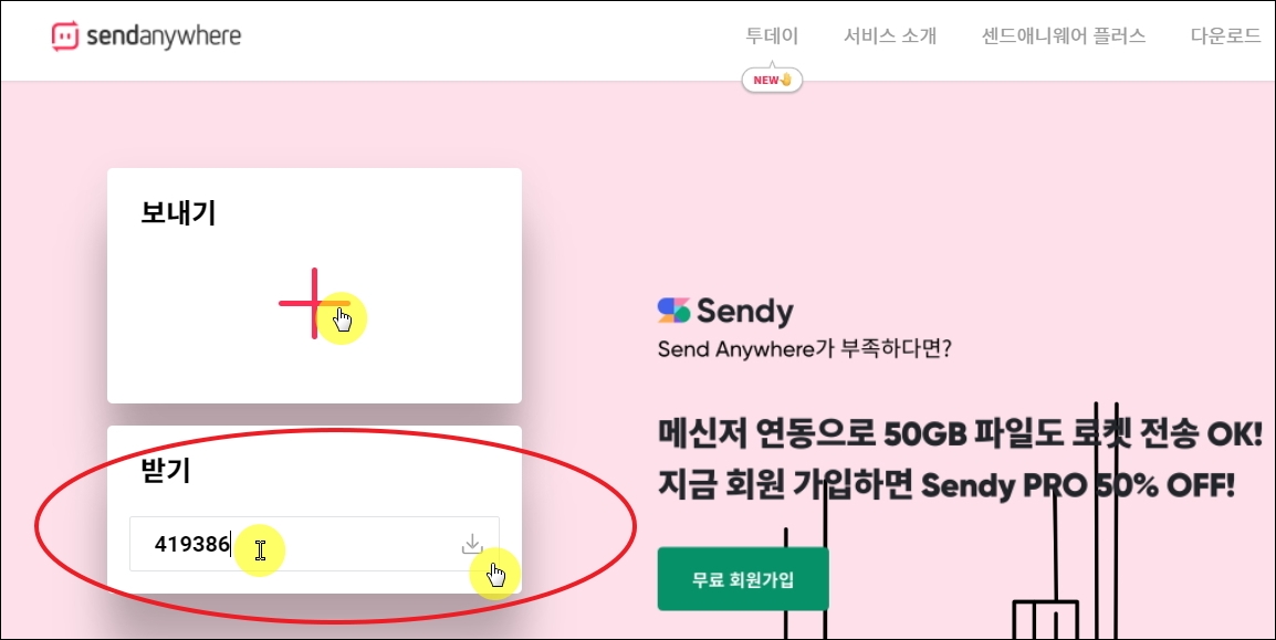 ▼센드에니웨어 공식 홈페이지에 접속하면 메인화면에 보내기와 받기 서비스가 보일 겁니다. 받기 영역을 보면 내용을 입력할 수 있는 칸이 있습니다. 여기에 좀 전에 핸드폰 앱을 통해 얻은 6자리 숫자키를 입력하면 됩니다. 입력 후에는 바로 옆에 있는 다운로드 버튼을 누르면 됩니다.