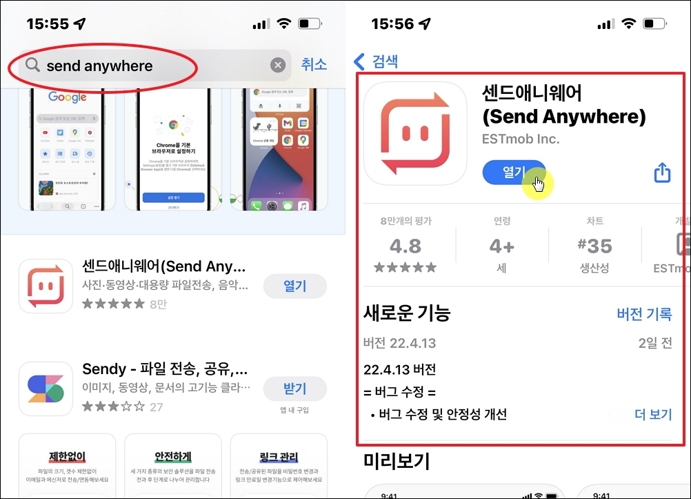 ▼이 방법을 사용하기 위해서는 앱을 하나 설치해야 합니다. 무료로 사용할 수 있고, 많은 사람이 이용할 정도로 만족도 높은 앱입니다. 아이폰, 안드로이드폰 모두 이용이 가능한 앱입니다. 바로 센드애니웨어인데, 이름 그대로 어디에서나 파일을 보낼 수 있는 앱입니다. 무료 다운 및 사용이 가능한 앱이고, 사용법이 매우 쉽습니다. 구글 플레이스토어나 앱스토어에서 "Send anywhere"를 검색하면 쉽게 찾아 다운 받을 수 있습니다.