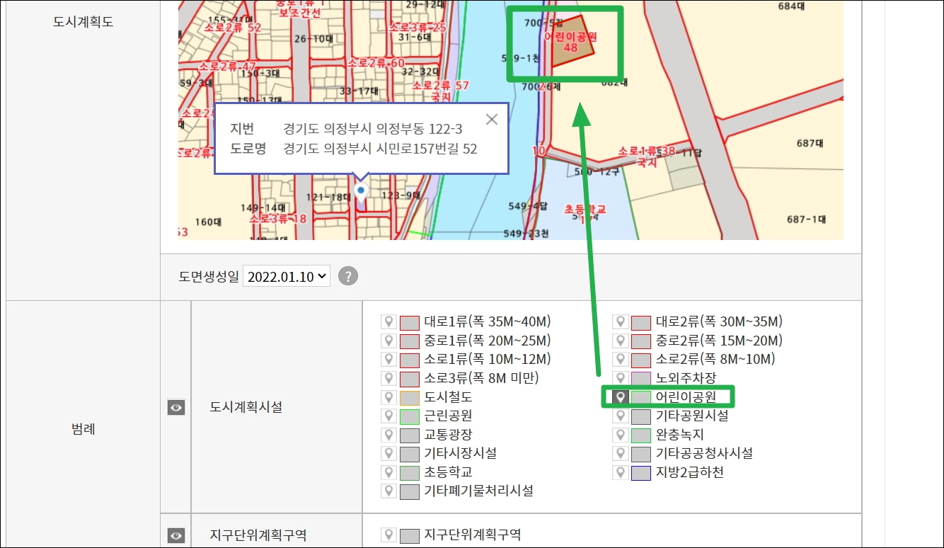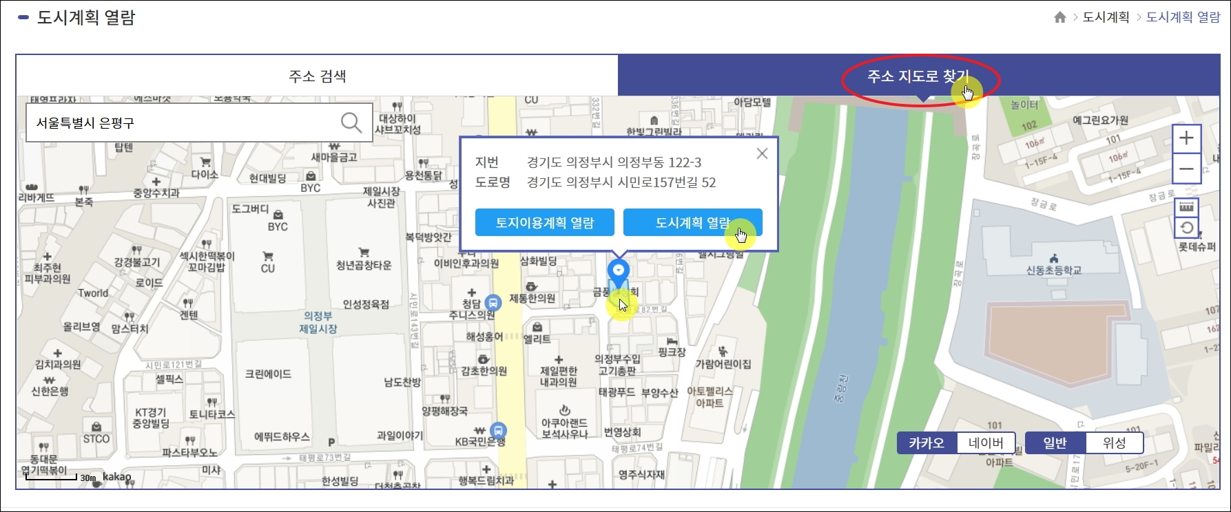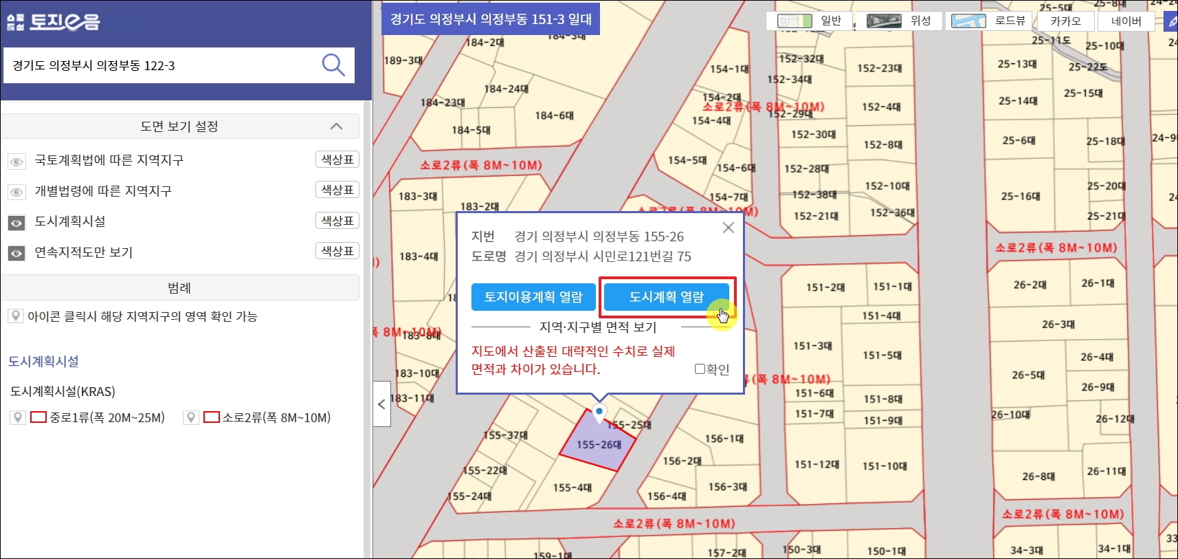 ▼도시계획도와 같은 지도를 이용하면 여러 도시계획 시설에 대한 정보를 쉽게 파악 가능합니다. 여기에 더하여 세부적인 토지이용계획 및 도시계획에 대한 확인원 열람을 할 수 있죠. 다음과 같이 지도 화면에서 마우스로 지역 탐색이 가능하기 때문에 정확한 주소를 몰라도 됩니다. 오히려 지도 서비스를 통해 특정 지역의 상세 주소를 열람할 수 있죠.