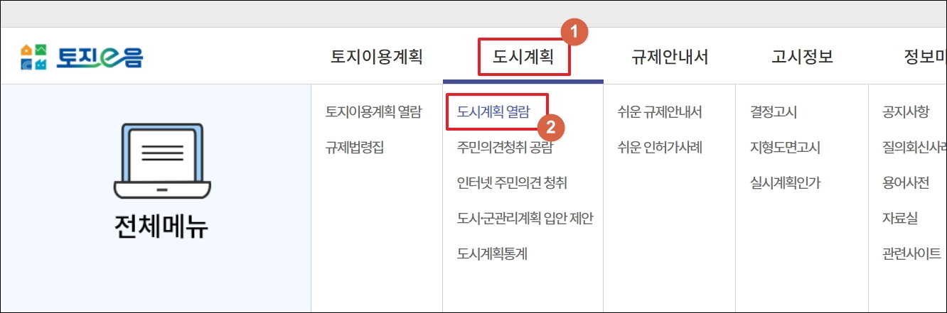 ▼토지이음 사이트에 접속했습니다. 메뉴에서 [도시계획]을 선택하면 나타나는 여러 메뉴 중 [도시계획 열람] 버튼을 클릭합니다. 참고로 이와 관련된 정보인 주민의견청취 공람, 인터넷 주민의경 청취, 도시계획 통계, 도시 및 군관리계획 입안 제안 서비스 메뉴도 있으니 참고하시길 바랍니다. 모르는 용어가 있을 때에는 [정보마당]의 하위 카테고리에 속하는 [용어사전] 메뉴를 이용하면 됩니다.