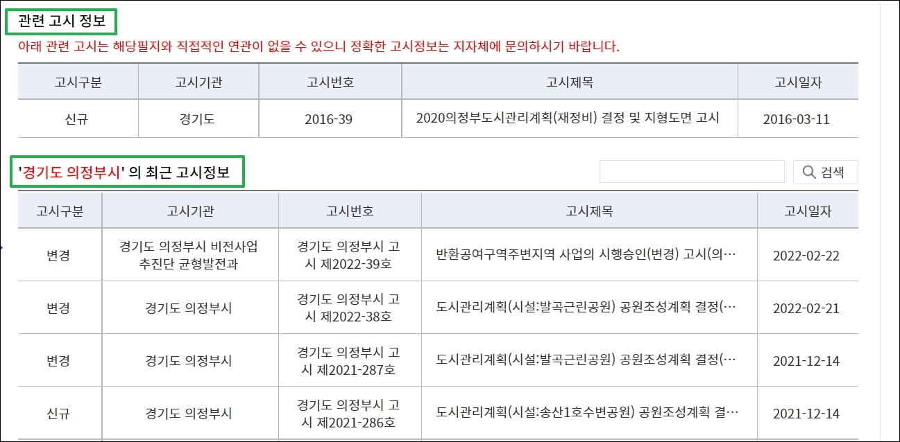 ▼도시계획 확인원을 통해서 고시 정보를 확인하는 것도 가능합니다. 신규 또는 변경된 고시 정보에 대한 기관, 번호, 제목, 일자를 알아볼 수 있습니다. 좀 더 상세한 정보를 얻고 싶으면 고시제목을 선택하면 됩니다. 그럼 새로운 페이지가 열리면서 PDF 파일로 된 관련 문서를 다운 받을 수 있습니다.