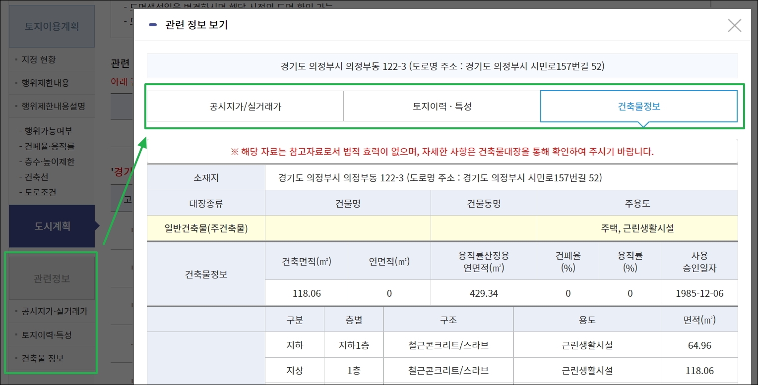 ▼도시계획 외에도 토지이용계획, 공시지가, 토지이력 및 특성, 건축물 정보, 실거래가에 대한 것도 알아볼 수 있습니다. 필요에 따라 선택적으로 정보를 이용하면 됩니다.