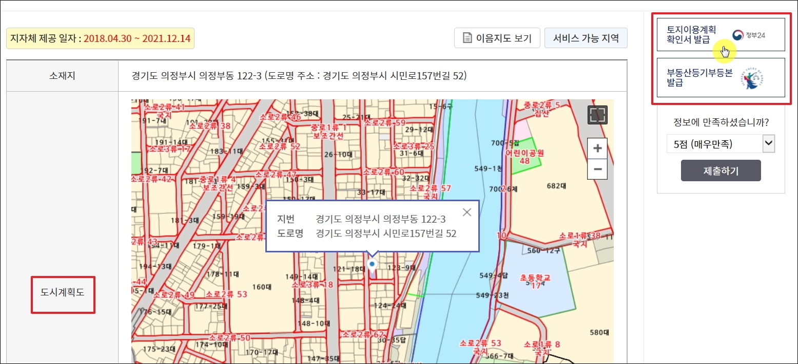 ▼가장 먼저 나오는 것은 앞에서 본 적이 있는 도시계획도 입니다. 지번과 도로명 주소, 그리고 여러 시설에 대한 정보로 구성되어 있습니다. (참고로 해당 화면 우측 상단에 보면 토지이용계획 확인서 발급과 부동산등기부 등본을 발급 받을 수 있는 메뉴가 있습니다.)