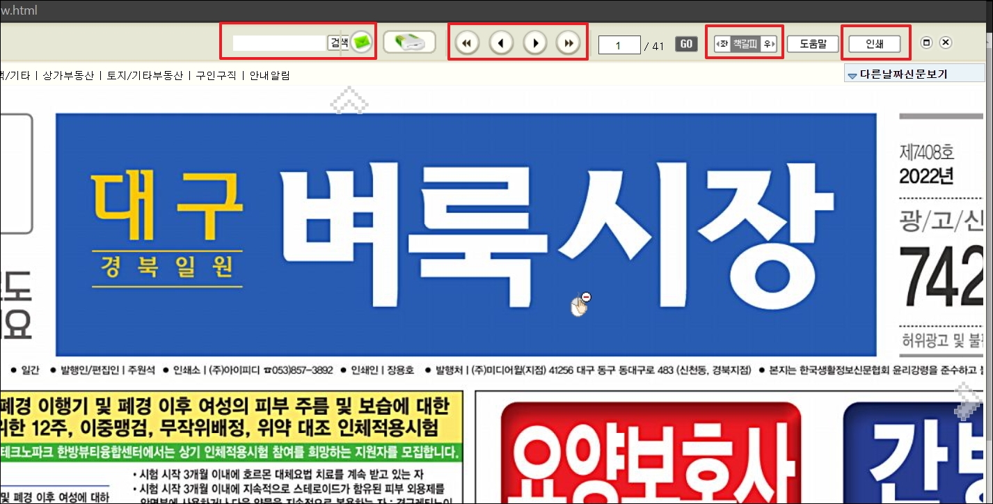 ▼다음과 같이 인터넷으로도 벼룩시장 서비스를 이용하는 경우 검색, 페이지 이동, 책갈피, 인쇄 기능을 사용하는 것이 가능합니다. 확대 기능도 갖추고 있기 때문에 글자가 흐릿해서 잘 보이지 않은 분들에게 더욱 좋죠. 개인적으로 검색을 통해 원하는 정보를 순식간에 찾을 수 있어서 좋습니다.