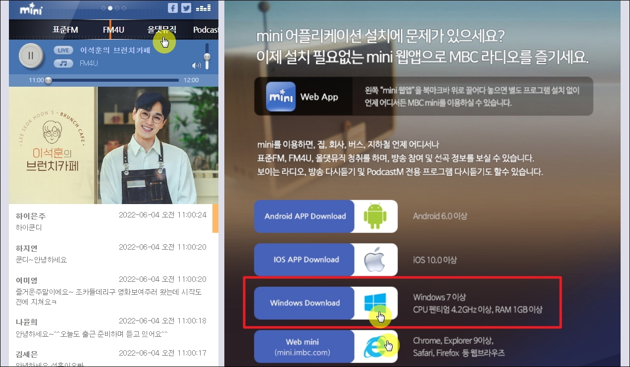 ▼새롭게 열린 페이지를 보면 바로 실시간듣기 가능한 웹플레이어가 나타납니다. 채널 선택을 다른 라디오 채널을 듣거나 올댓뮤직과 같이 음악만 나오는 채널을 선택하는 것이 가능합니다. 실시간으로 올라오는 댓글도 읽어볼 수 있으니 소통도 수월합니다. 화면 우측에 보면 [Windows Download] 버튼이 있는데, 해당 버튼을 누르면 앞서 언급한 전용 플레이어를 설치할 수 있습니다.