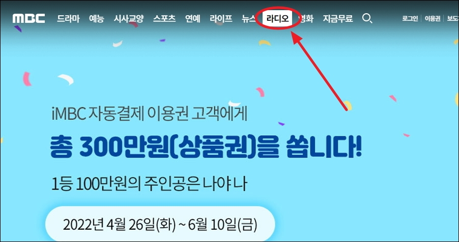 ▼참고로 mbc 사이트를 이용하거나 전용 프로그램을 통해 라디오 듣기를 할 때 비용이 전혀 들지 않습니다. 인터넷이 되는 컴퓨터 또는 스마트폰만 있으면 돼요. 홈페이지에 접속하면 메뉴에서 [라디오] 선택합니다.