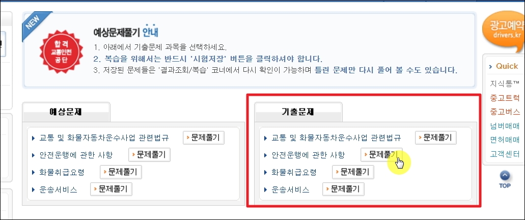 ▼드라이버스 사이트에서는 화물운송 자격시험에 관련된 기출문제를 만나볼 수 있는 곳입니다. 여기서 버스운전자격시험과 한 과목만 다를뿐, 나머지 3과목은 중복이 됩니다. 그렇기 때문에 화물운송 자격시험 기출문제를 통해 시험 준비를 할 수 있습니다.