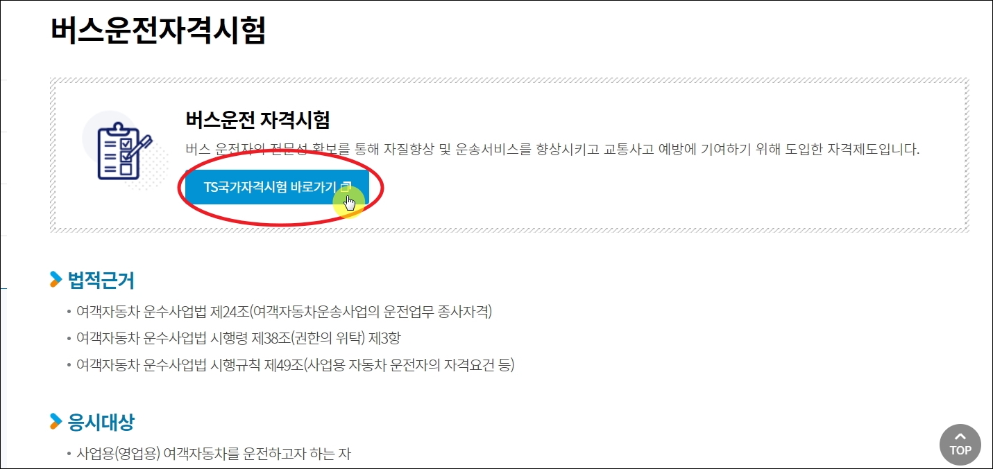 ▼버스운전자격시험 관련 페이지가 열렸습니다. 이곳에서는 법적근거, 응시대상, 과목, 기준, 시험 일정에 대해 알아볼 수 있습니다. 여기서 페이지 상단에 있는 [TS국가자격시험 바로가기] 버튼을 누릅니다.