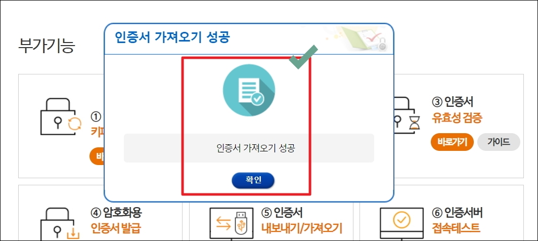 ▼"인증서 가져오기 성공" 알림이 뜨면 제가 알려드리는 방법을 제대로 진행한 것입니다. 이제 은행이나 공공기관 사이트에 접속해서 옮겨진 공인인증서를 사용할 수 있는지 확인해 보면 됩니다.