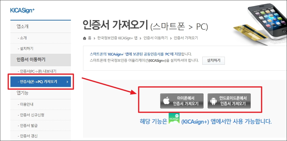 ▼스마트폰 전용 인증서 복사 페이지가 열렸습니다. 여기에서 좌측에 있는 메뉴에서 [인증서(폰 → PC) 가져오기]를 선택합니다. 그 다음 화면에 나타난 [아이폰에서 인증서 가져오기] 또는 [안드로이드폰에서 인증서 가져오기]를 선택하면 됩니다. 이 다음부터는 안내에 따라 진행하면 됩니다.