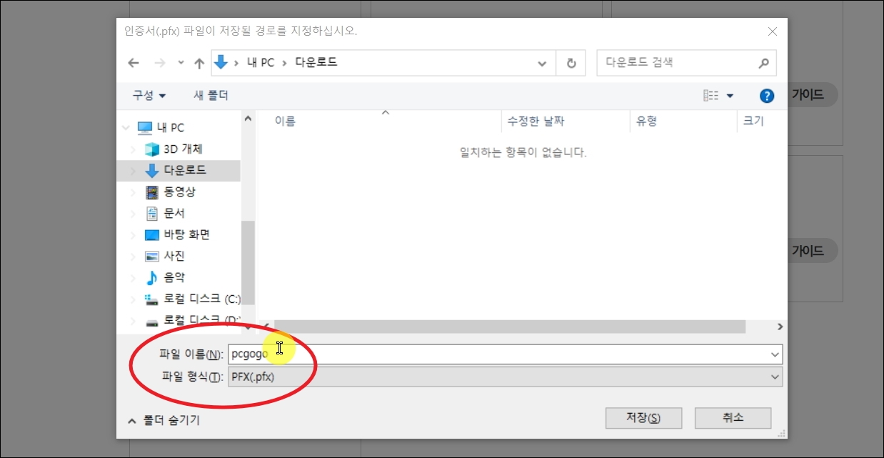 ▼[내보내기] 버튼을 누르면 내보낼 파일의 이름을 지정하는 단계로 넘어갑니다. 확장자가 pfx로 되어 있는 파일입니다. 이 파일만 있으면 pc는 물론이고, 또 다른 전자기기로 옮기는 것이 가능합니다. 참고로 스마트폰에서 pc로 공인인증서 옮기는 방법은 후반부에 있습니다.