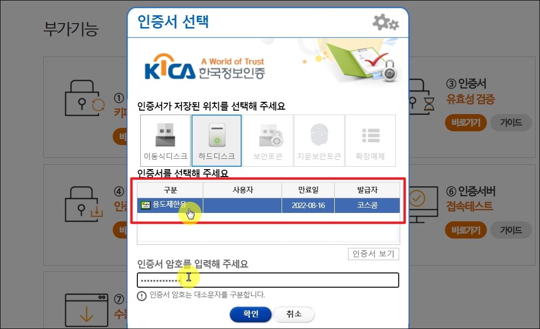 ▼내보낼 인증서를 선택할 차례입니다. 인증서 선택 후에는 암호를 꼭 입력해야 합니다.