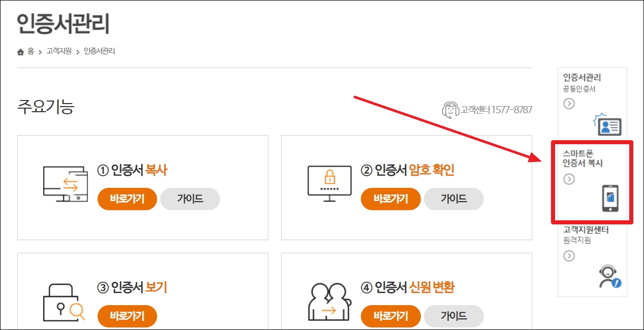 ▼지금까지 범용으로 사용할 수 있는 방법을 알려드렸습니다. 스마트폰에 들어 있는 공인인증서를 pc로 옮기고 싶을 때에는 한국정보인증 사이트 화면에서 우측에 있는 [스마트폰 인증서 복사] 서비스를 이용하면 됩니다.
