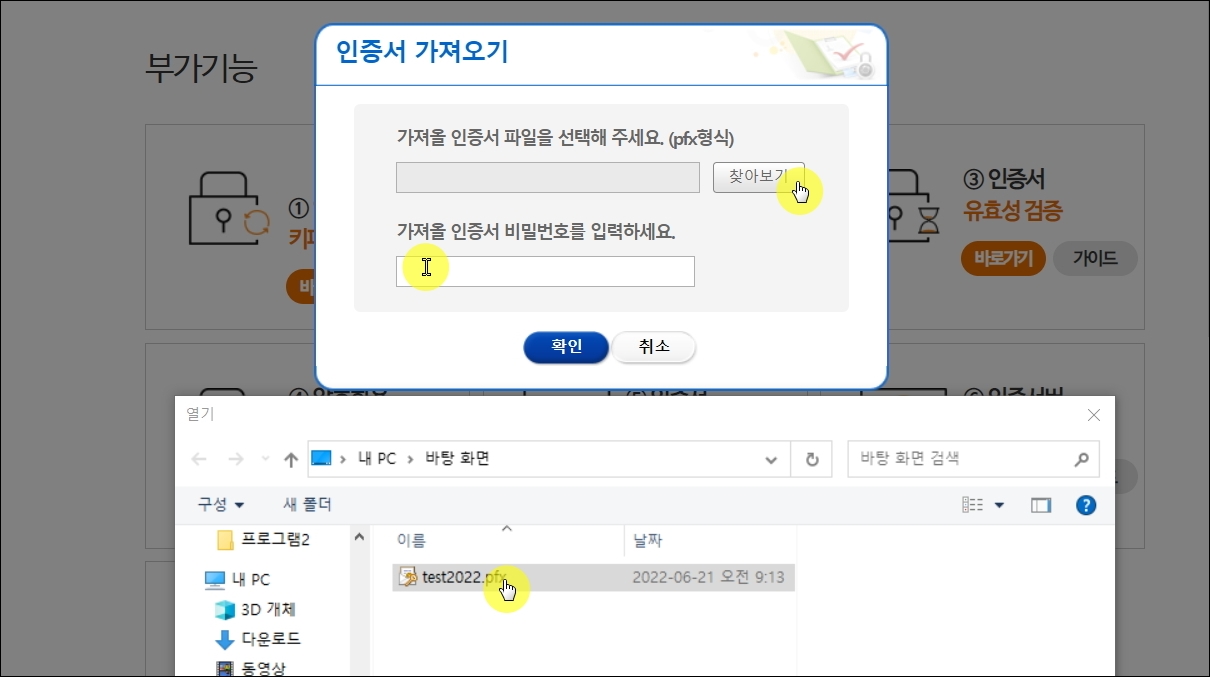 ▼[가져오기] 버튼을 누른 후 우리가 복사한 pfx 파일을 선택합니다. 그 다음 공인인증서의 비밀번호를 입력하고, [확인] 버튼을 누릅니다.