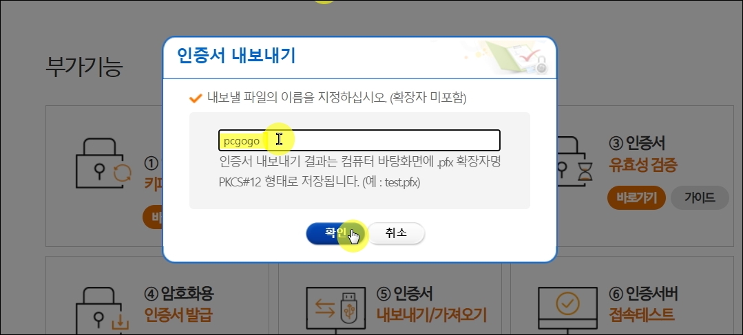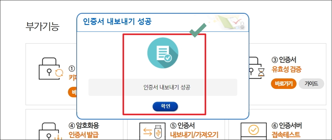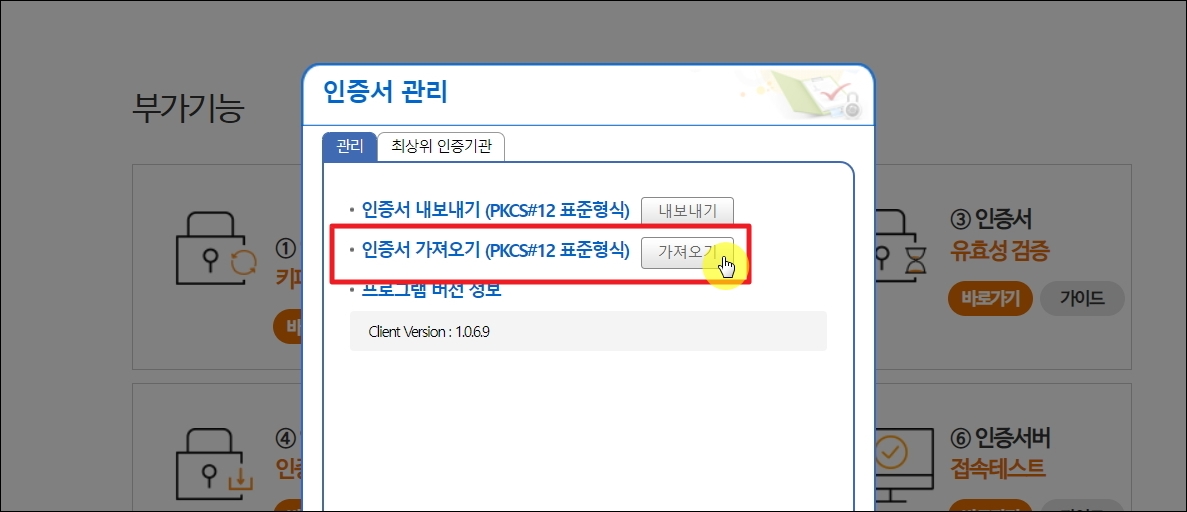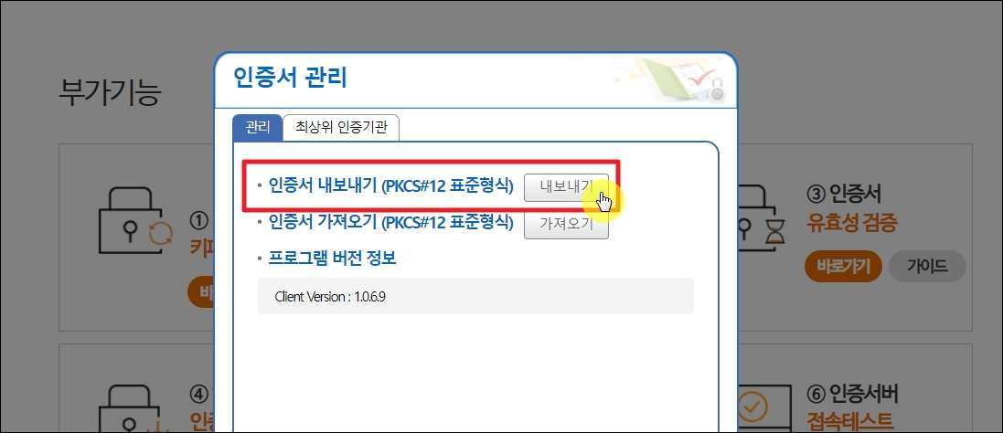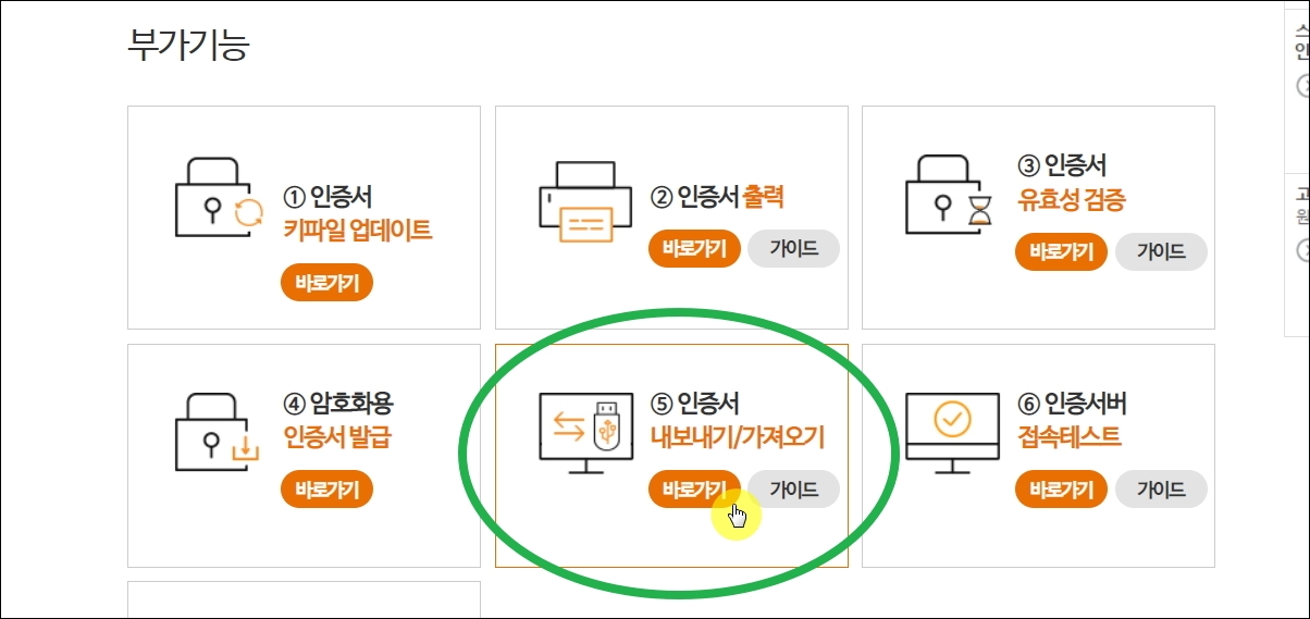 ▼새롭게 열린 페이지를 보면 인증서에 대한 여러 가지 관리도구 서비스가 나타납니다. 여기에서 부가기능에 있는 공인인증서 내보내기 및 가져오기를 선택합니다.