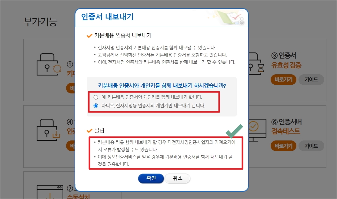 ▼인증서와 개인키를 내보내려고 할 때 선택해야 하는 것이 있습니다. 정보인증서비스를 받을 경우에는 [예]를 선택하면 되고, 타전자서명인증사업자에서 가져오기 진행을 할 경우에는 [아니오]를 선택하면 됩니다. 저는 [아니오] 선택을 했는데, 아무 문제 없이 pc로 공인인증서를 옮기는 것이 가능했습니다.