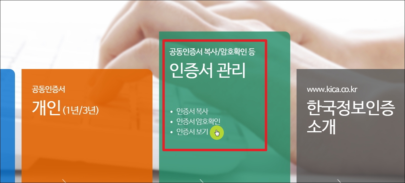 ▼한국정보인증 사이트를 이용한 공인인증서 pc로 옮기는 방법을 알려드리겠습니다. 처음 홈페이지에 접속하면 4가지 메뉴가 화면에 나타납니다. 여기에서 3번째 위치한 인증서 관리를 선택합니다.