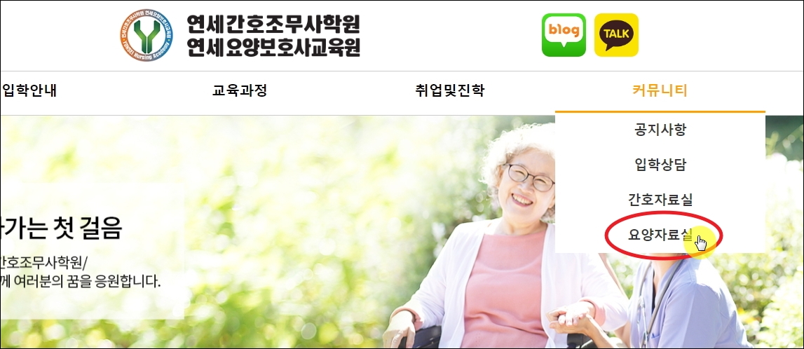 ▼해당 사이트의 본래 목적은 학원 이용에 관련된 내용을 주로 이루고 있습니다. 입학안내, 교육과정, 취업 및 진학 메뉴를 보면 알 수 있죠. 여기에서 마지막 메뉴인 [커뮤니티]를 선택하면 [요양자료실] 메뉴를 찾을 수 있습니다.