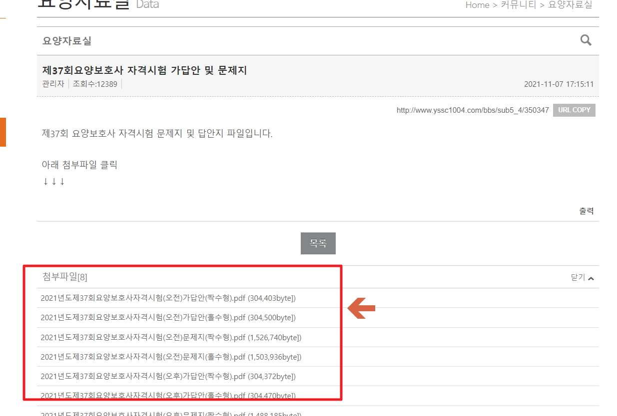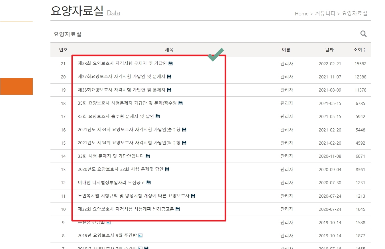 ▼요양 자료실 페이지가 열렸습니다. 회차별로 요양보호사 자격시험 기출문제와 가답안 자료를 제공하고 있는데요. 자료실에서 풀어보고 싶은 기출문제 게시물을 마우스로 클릭해 보시길 바랍니다.