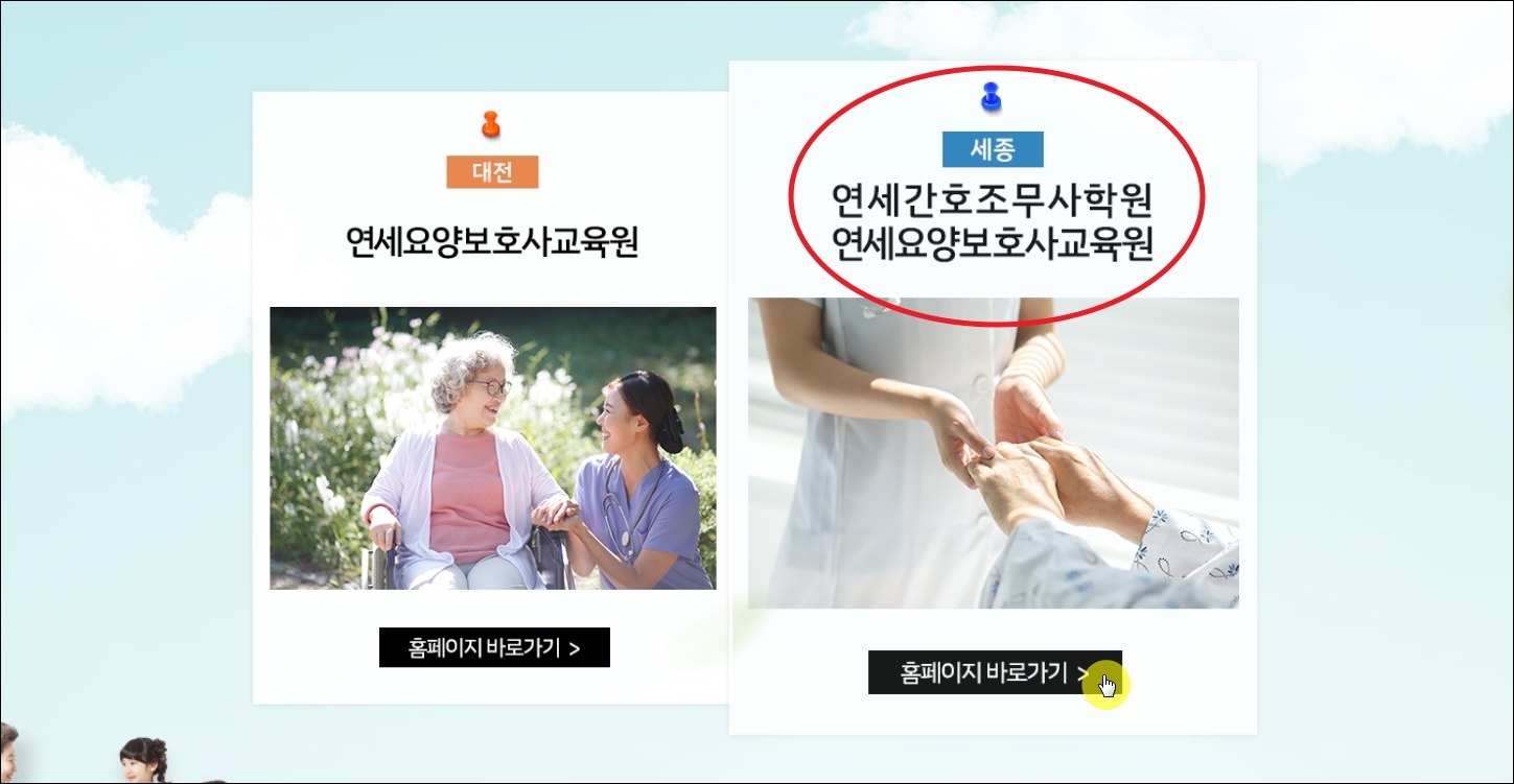 ▼사이트에 접속하면 첫 페이지에서 지역을 선택하도록 되어 있습니다. 세종에 있는 연세 요양보호사 교육원 홈페이지를 선택하면 됩니다.