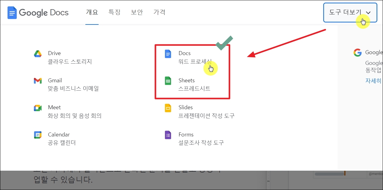 ▼Google Docs 사이트에 접속했습니다. 메뉴에서 [도구 더보기]를 클릭해 보세요. 그럼 여러 가지 문서작성 프로그램이 나타납니다. 이번 시간에 사용해보려고 하는 것은 워드 프로세서와 스프레드시트입니다. 여기서 스프레드시트는 MS의 엑셀과 유사한 소프트웨어 입니다. 슬라이드는 MS의 파워포인트와 유사하고요.
