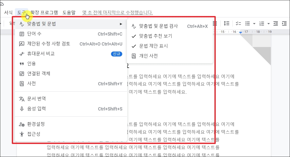 ▼메뉴에서 [도구]를 클릭해 보세요. 그럼 맞춤법과 문법 검사, 단어 수 세기, 제안된 수정 사항 검토, 인용, 사전, 번역, 음성 입력 등 다양한 도구를 사용할 수 있습니다. 노트북을 사용하고 계신다면 바로 [음성 입력] 기능을 사용해 보세요. 정말 편하게 문서작성을 할 수 있습니다. 성능이 좋아져서 음성 인식이 정말 잘 됩니다.