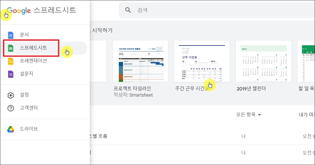▼엑셀 문서를 작성하고 싶은 경우라면 스프레드시트를 이용해 보세요. 구글 문서 사이트에서 좌측 상단에 있는 메뉴를 클릭하면 스프레드시트 메뉴를 찾을 수 있습니다. 여기서도 다양한 템플릿을 제공하고 있는데요. 스프레드시트 특성상 프로젝트 타임라인, 주간 근무 시간표, 캘린더, 할 일 목록을 만들 때 유용합니다.