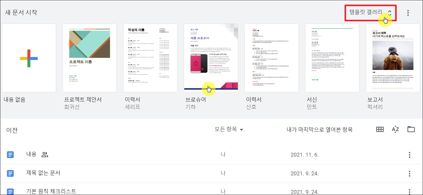 ▼먼저 무료 워드프로세서 프로그램을 사용해 보겠습니다. 빈 문서로 시작할 수도 있지만, 템플릿을 사용하면 어떤 문서든 쉽게 시작하고, 빠르게 작성이 가능합니다. 이곳에서 제공하는 템플릿의 종류는 다양합니다. 프로젝트 제안서, 이력서, 서신, 보고서, 브로슈어 등이 보이는데, 더 많은 템플릿을 원한다면 [템플릿 갤러리] 메뉴를 클릭하면 됩니다.