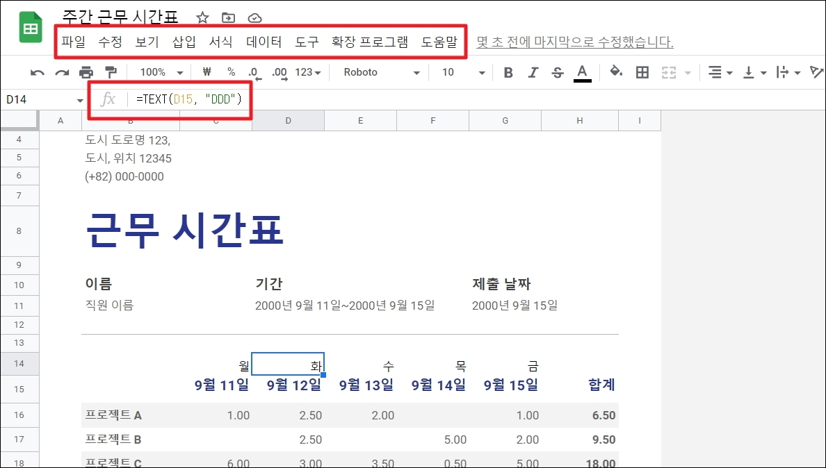 ▼구글 스프레드시트에서 주간 근무 시간표 템플릿을 열어 보았습니다. 기존 엑셀 프로그램과 동일하게 함수 사용이 가능합니다. 엑셀의 기본 기능은 물론이고, [확장 프로그램] 메뉴를 선택하면 많은 기능을 추가할 수 있습니다.
