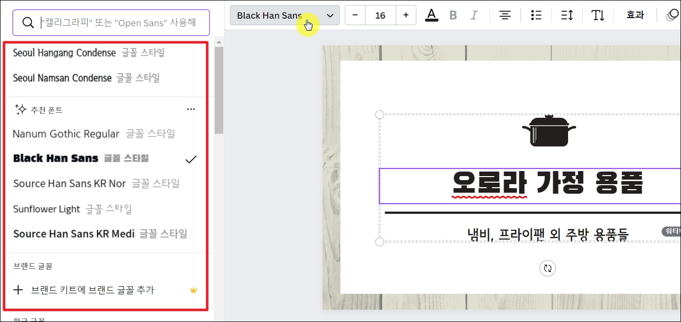▼명함에 사용할 예쁜 글꼴이 많이 마련되어 있습니다. 많은 사람들이 선호하는 나눔고딕 글꼴, 선플라워 라이트 글꼴 등이 보이네요. 다른 명함 만들기 사이트에 비해 예쁜 한국어 글꼴이 많아 좋습니다.