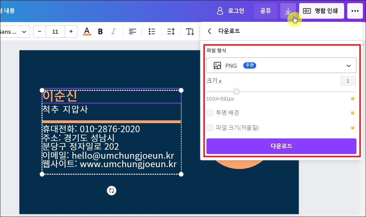 ▼내 마음대로 명함 템플릿을 수정한 후, 이미지 파일로 다운을 받을 수 있습니다. 파일 형식이나 크기를 변경할 수 있고, 투명 배경 사용도 가능합니다. 편집기에서 우측 상단에 있는 다운로드 아이콘을 선택하면 파일 저장이 가능합니다.