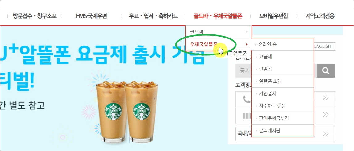 ▼사이트에 접속하면 여러 메뉴를 만나 볼 수 있습니다. 주로 우편이나 우표, 소포에 대한 메뉴가 많죠. 여기에서 우체국 알뜰폰 메뉴를 선택합니다.