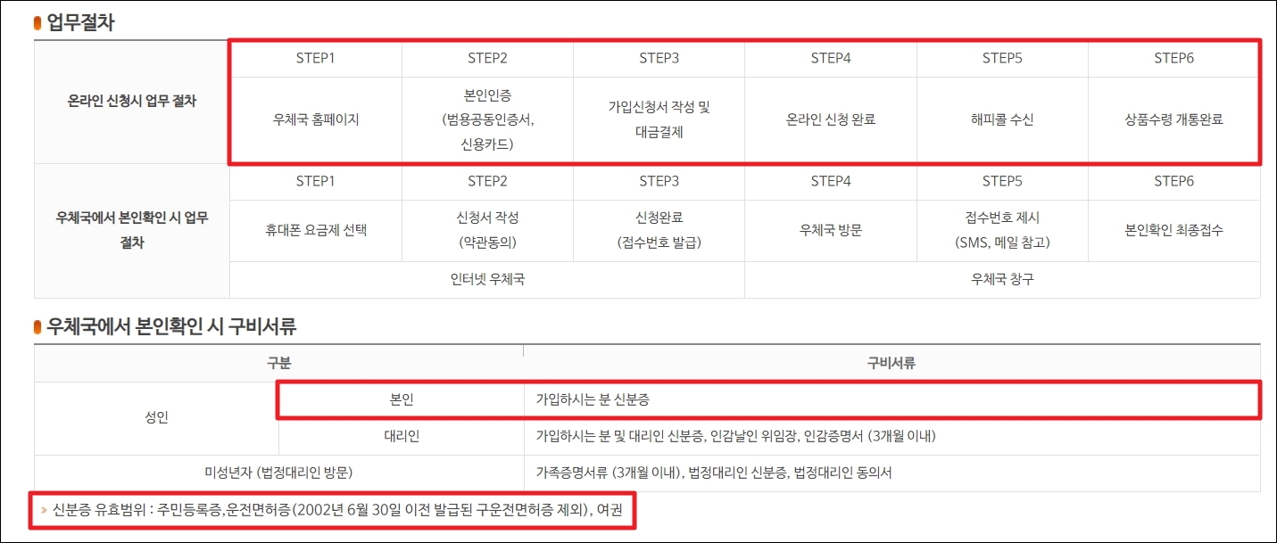 ▼기본적으로 알뜰 요금제를 가입하기 위해서는 다음과 같이 두 가지 가입 방식이 있다는 것을 알고 있어야 합니다. 온라인으로 신청 하는 방법과 우체국에 방문하여 진행하는 방법 입니.다 우체국을 방문하는 경우에는 신분증이 필요하고, 대리인인 경우에는 그에 따른 구비 서류가 필요합니다. 온라인으로 신청할 때도 준비해야 할 것이 있습니다. 바로 본인 인증을 할 수 있는 도구입니다. 인증서나 카드가 있죠.