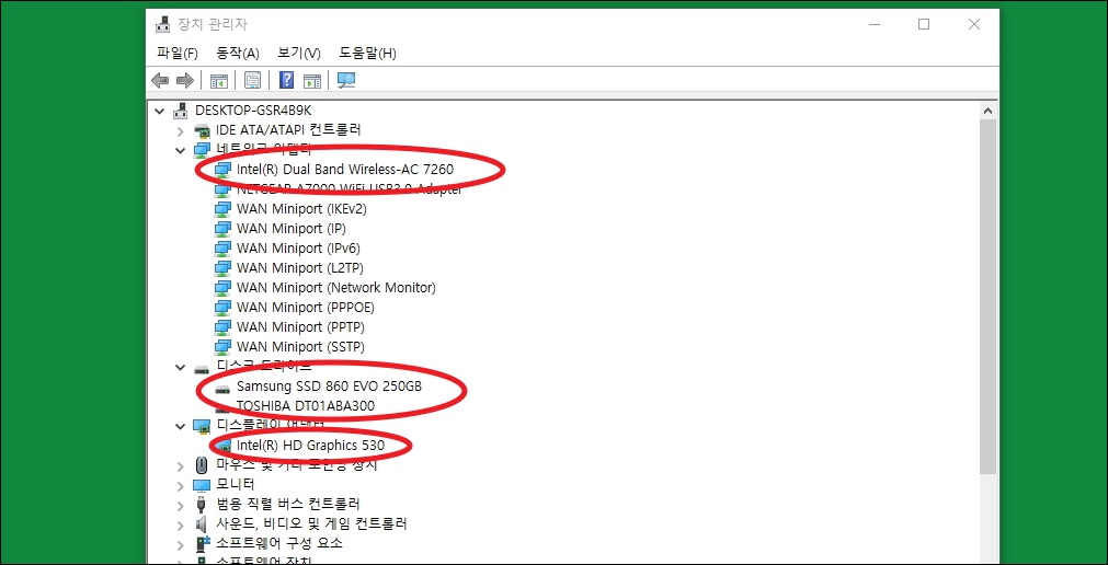 ▼장치관리자를 이용하여 컴퓨터 사양 확인하기 가능합니다. 궁금한 하드웨어의 이름을 클릭해 보세요. 저는 네트워크 어댑터, 디스크, 디스플레이 어댑터를 클릭해 보았습니다. 이렇게 하면 해당 부분에 관련된 하드웨어 목록이 나타납니다. 저는 랜카드로 ac7260 사용하고 있고, 삼성의 SSD 와 도시바에 HDD를 사용하고 있습니다. 추가로 내장 그래픽카드를 사용하고 있음을 알 수 있습니다.