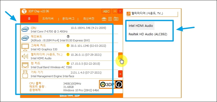 ▼이번에는 무료 프로그램을 이용하여 컴퓨터 사양을 알아보는 방법을 알려 드리겠습니다. 해당 프로그램의 경우에는 드라이버도 자동으로 찾아 주기 때문에 정말 편리합니다. 컴퓨터를 처음 구매했을 때 사용하면 정말 좋아요. 3dp chip 사이트에서 다운 받을 수 있습니다.