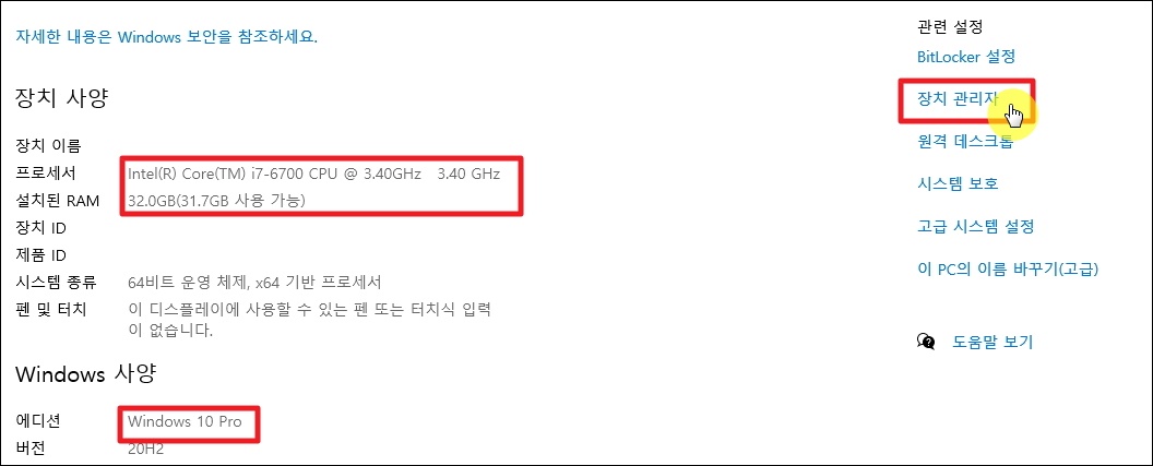 ▼컴퓨터에서 가장 핵심이라고 볼 수 있는 CPU(프로세서)와 RAM에 대한 정보가 나왔네요. 윈도우즈 사양도 나와 있으니 확인해 보시기 바랍니다. 이 밖에 다른 사양을 확인하고 싶다면 화면 우측에 있는 장치관리자를 클릭해주세요.