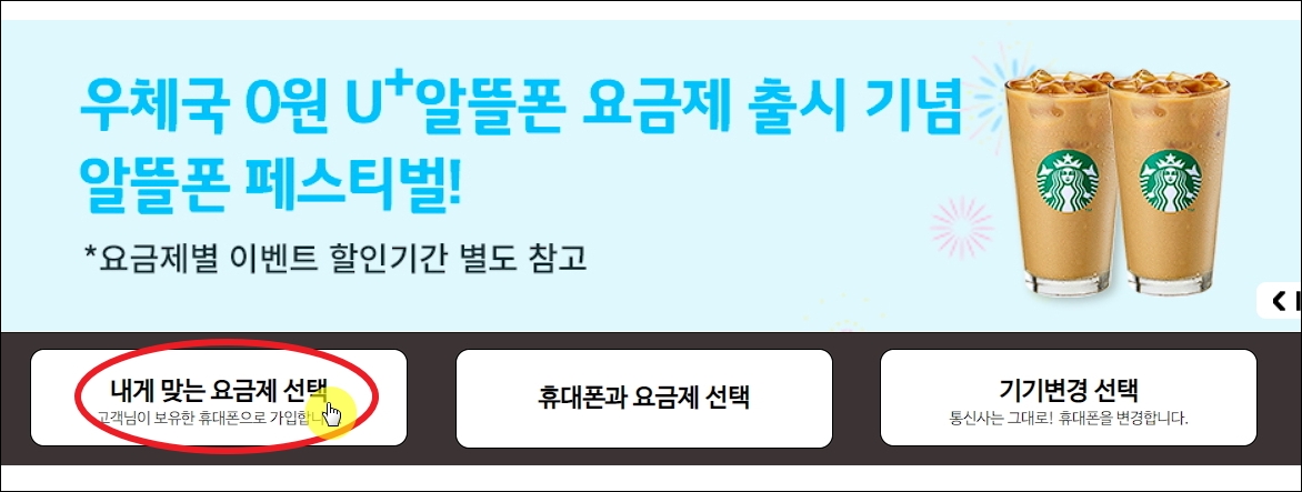 ▼우체국 알뜰폰 메뉴를 선택하면 다음과 같은 화면이 나타납니다. 최근 일부 LG 유플러스 알뜰폰 요금제를 가입하면 음료 쿠폰을 제공하는 이벤트를 진행하고 있네요. 화면을 보면 3가지 메뉴가 나타나는데요. 이중에서 [내게 맞는 요금제 선택] 버튼을 눌러 보세요. 마음에 드는 알뜰폰 통신사는 물론이고, 해당 통신사의 요금제를 쉽게 찾을 수 있습니다.