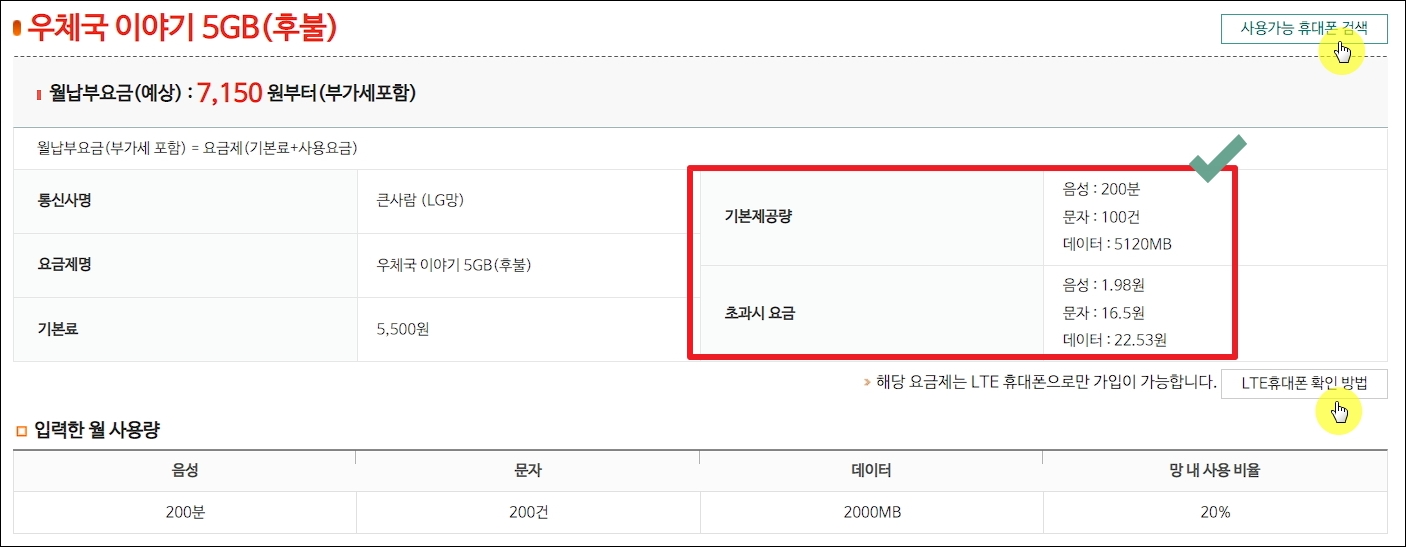 ▼우체국 이야기 5GB 요금제에 대한 상세 페이지가 열렸습니다. 기본 제공량과 더불어 음성, 문자, 데이터에 대한 초과시 요금을 확인할 수 있습니다. 화면 오른편에 보면 사용가능 휴대폰 검색과 LTE휴대폰 확인 방법이 있습니다. 해당 버튼을 눌러 본인이 LG 유플러스 회선을 사용할 수 있는지 또는 LTE 사용이 가능한 기기를 갖고 있는지 확인해 보시길 바랍니다.
