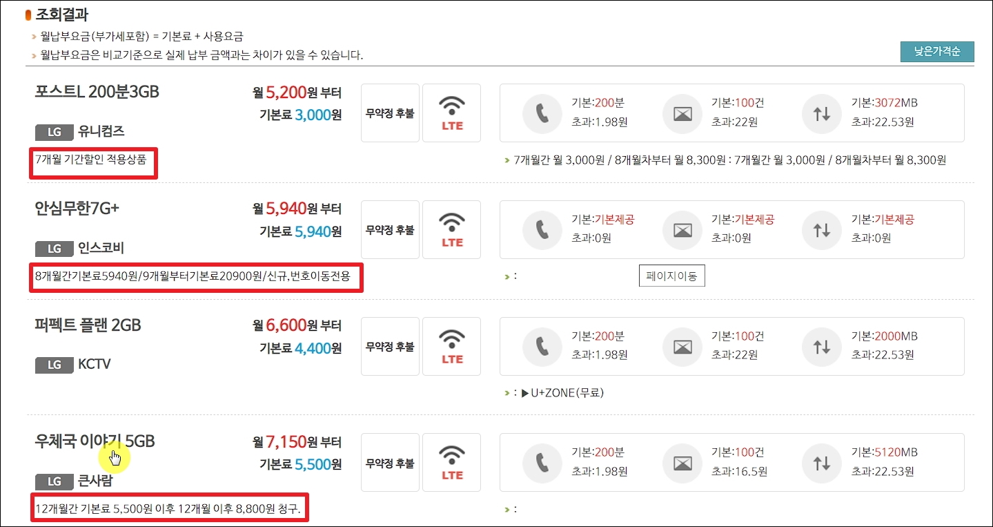 ▼결과가 나오면 리스트에서 우측 상단에 있는 [낮은 가격순]을 클릭합니다. 그럼 가장 저렴한 알뜰폰 요금제부터 살펴볼 수 있습니다. 여기 나온 요금제들은 모두 LG 유플러스 통신망을 사용하는 것들입니다. 제 사용량에 맞는 것들이 몇 가지 나왔는데요. 우체국 이야기 5GB가 마음에 드네요. 12개월간 기본 요금이 5,500원이고, 12개월 이후에 8,800원 청구가 된다고 합니다. 클릭해 보겠습니다.